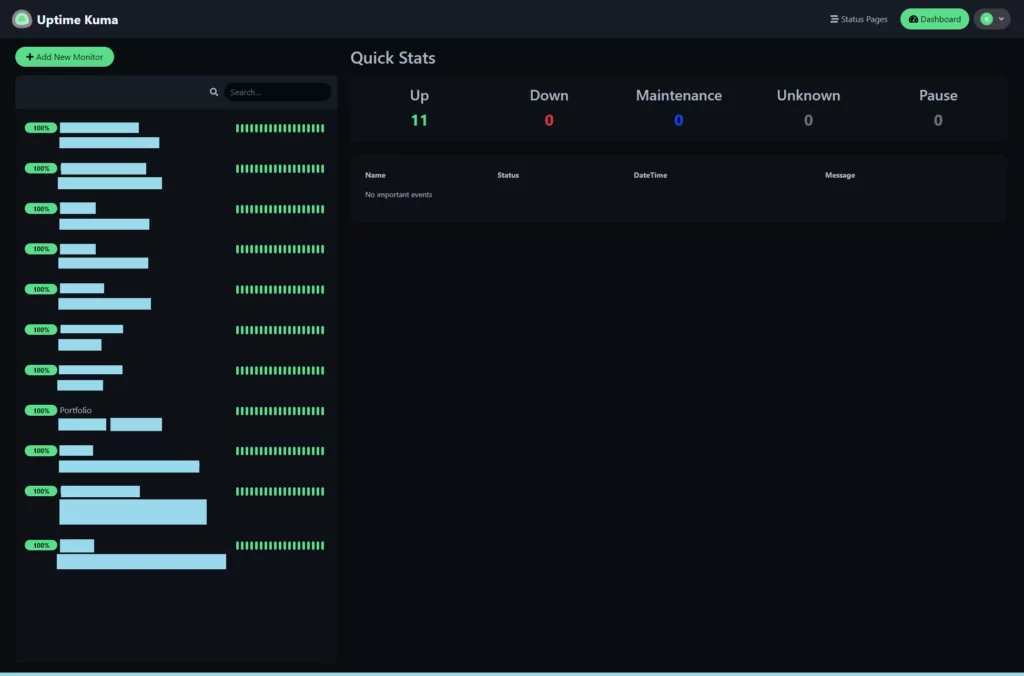 Uptime Kuma is a self-hosted monitoring tool that allows you to keep track of your services’ uptime and response times. Built on Node.js, it is both lightweight and user-friendly, making it suitable for both small-scale projects and large-scale deployments. With Uptime Kuma, you can monitor services using HTTP(s), TCP, or ICMP, and receive notifications via various channels, such as email, Slack, Telegram, or Webhooks, if any of your services go down.