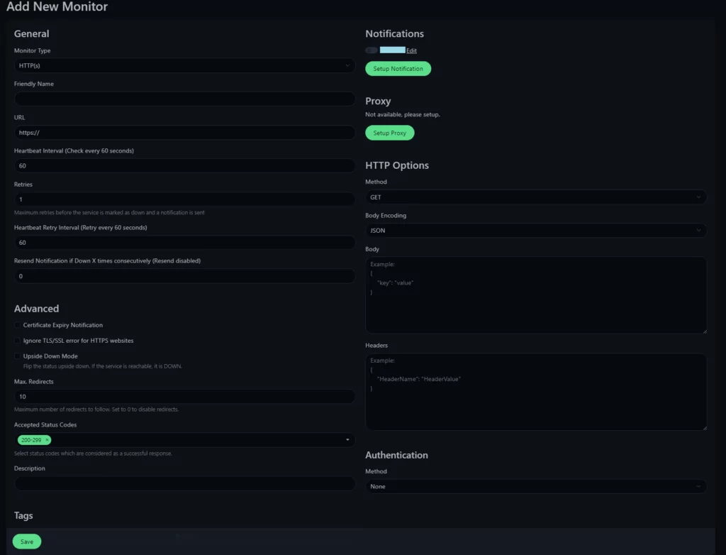 Additionally, you can configure advanced settings, such as custom HTTP headers, expected status codes, or response time thresholds.